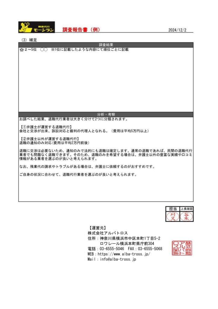 サービス利用時に依頼者の方へ提出する調査報告書の一例を添付します。