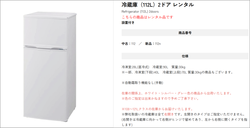 家電レンタルサービス会社によっては、どんなメーカーか、どれくらいのサイズ・色の家電かレンタル品が届くまで分からないケースもあります。