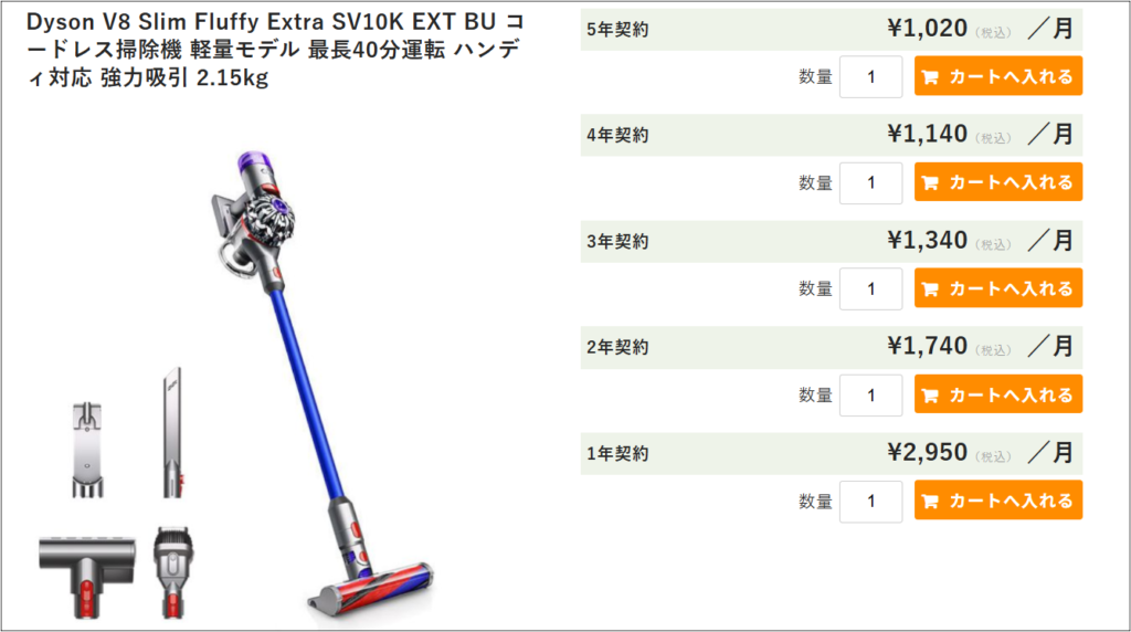レンタルできる家電の中には、普通に購入すると高価な家電もあります。例として、吸引力の高さと軽量さで有名なダイソン(Dyson)のコードレス掃除機について、購入した場合とレンタルした場合を比較して解説します。