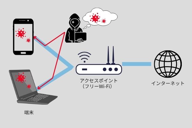 ウイルス感染は、上記の通信中に個人情報が盗まれる危険性と同じように、フリーWi-Fiのセキュリティが弱いことによって感染する危険性が高まります。