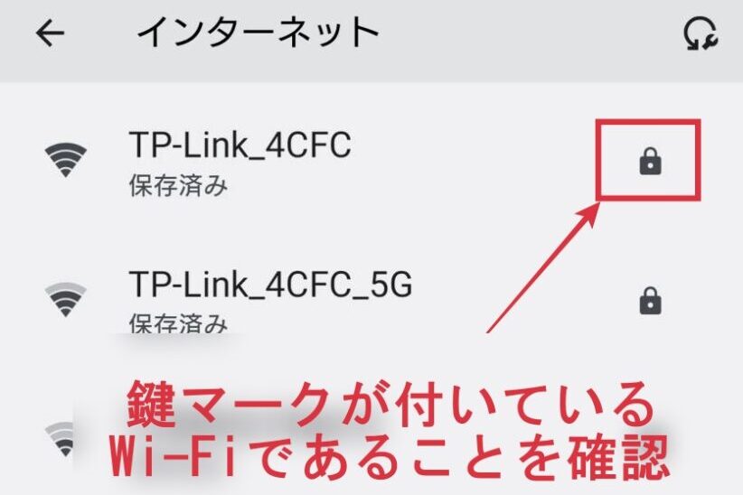 セキュリティがかかっているかどうかは、Wi-Fiにつなぐ際の画面に鍵マークがあるかどうかで判断できます(以下画像参照)。