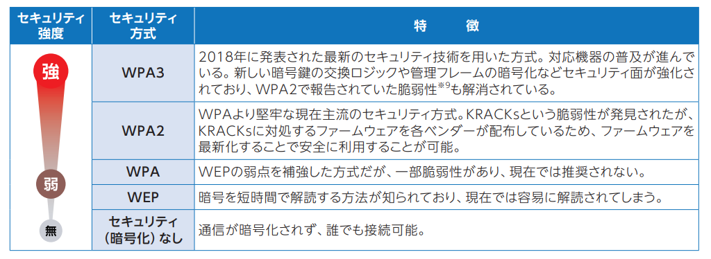 接続しようとしているフリーWi-Fiが安全かどうかの確認も必須です。Wi-Fiのセキュリティは、以下の図で示している通りセキュリティなし~WPA3までの5つの段階に分かれています。