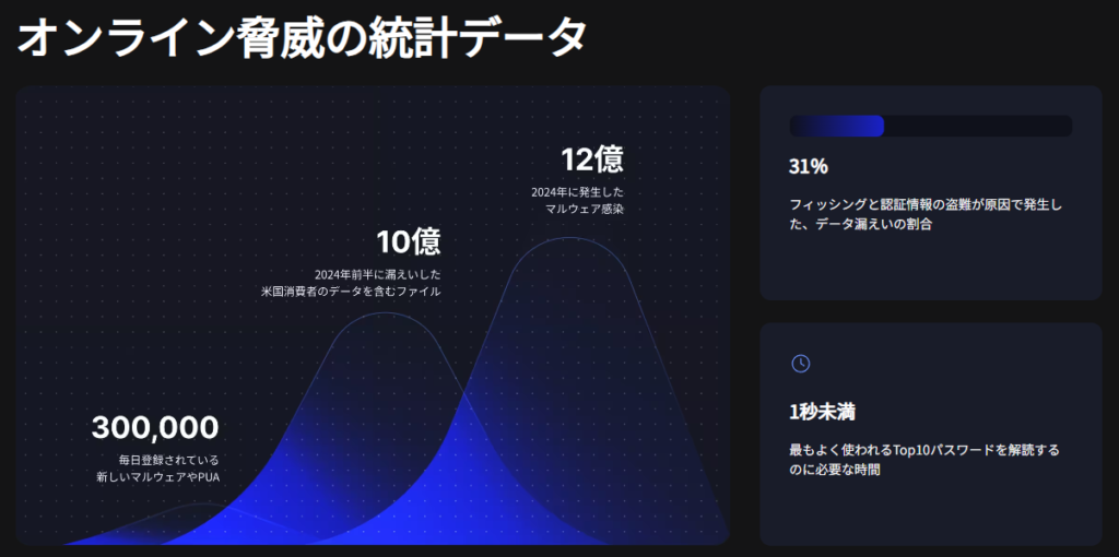 NordVPNによると、2025年の6月だけでブロックした詐欺サイトやマルウェアの件数は、5,000万件以上だったとしています(参照:脅威対策Pro™。日々の暮らしを守るオンラインセキュリティ🛡️)。また同社の統計データによると、米国で2024年前半に漏洩した個人情報は10億件以上、ハッキングでパスワードを盗む際に必要な時間は1秒未満であったとしています。