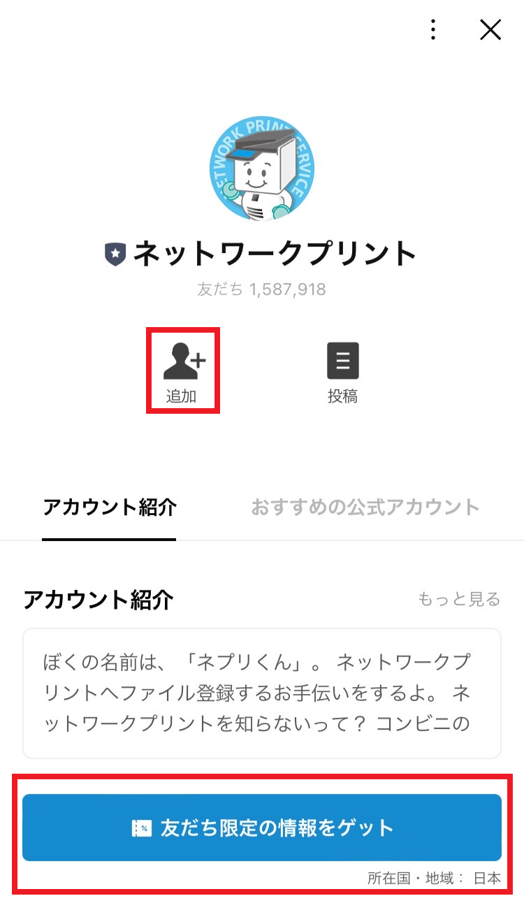 LINE上で「ネットワークプリント」と検索して『ネットワークプリント』のアカウントを友達追加します。