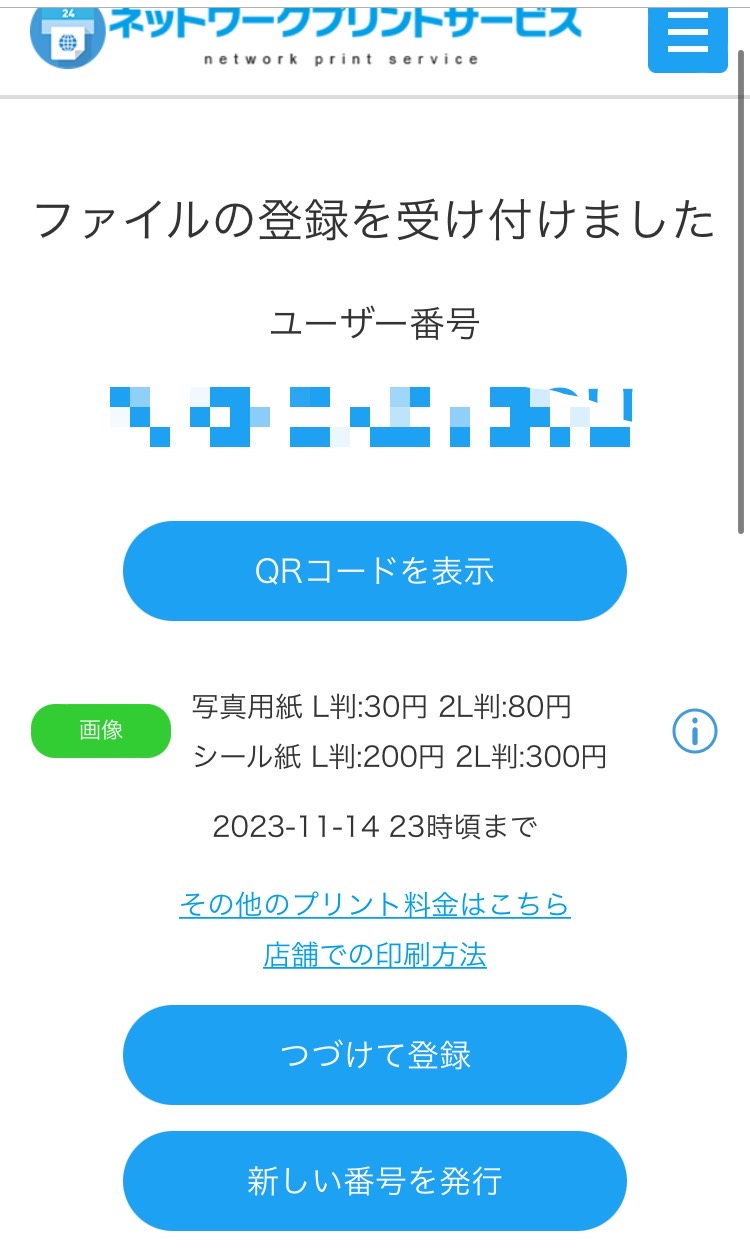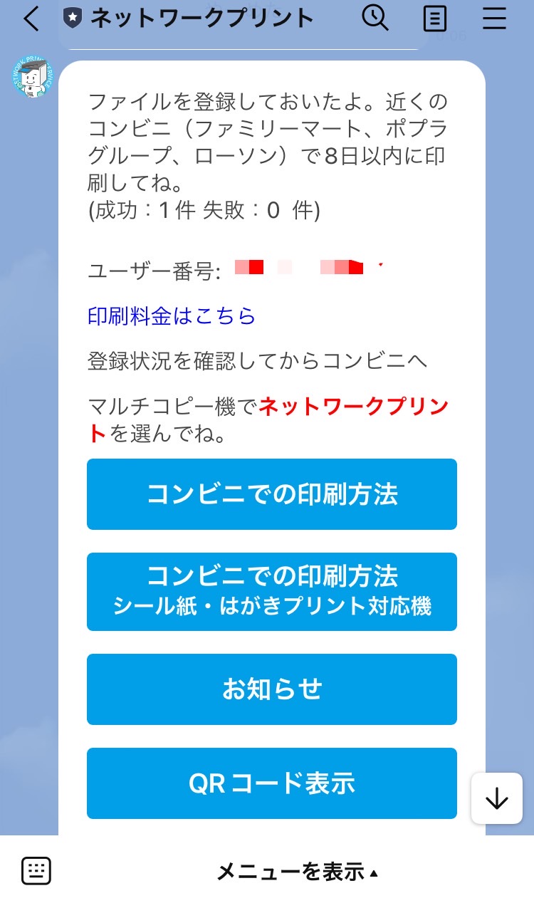 ファイルを登録し、コンビニのマルチコピー機でプリントするためのユーザー番号を発行します。
